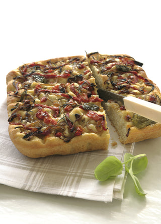 - Προθερμαίνουμε το φούρνο στους 190˚C. Βουτάμε τα δάχτυλά μας στο υπόλοιπο λάδι για να ξαναδημιουργήσουμε λακκουβάκια στην επιφάνεια της ζύμης. Κατόπιν απλώνουμε τις πιπεριές σε ίσες ποσότητες, πασπαλίζουμε με δενδρολίβανο το οποίο έχουμε τρίψει και το χοντρό αλάτι και περιχύνουμε με το λάδι που έχει περισσέψει. Ψήνουμε για 25-30 λεπτά. Σερβίρεται είτε χλιαρή είτε κρύα.
