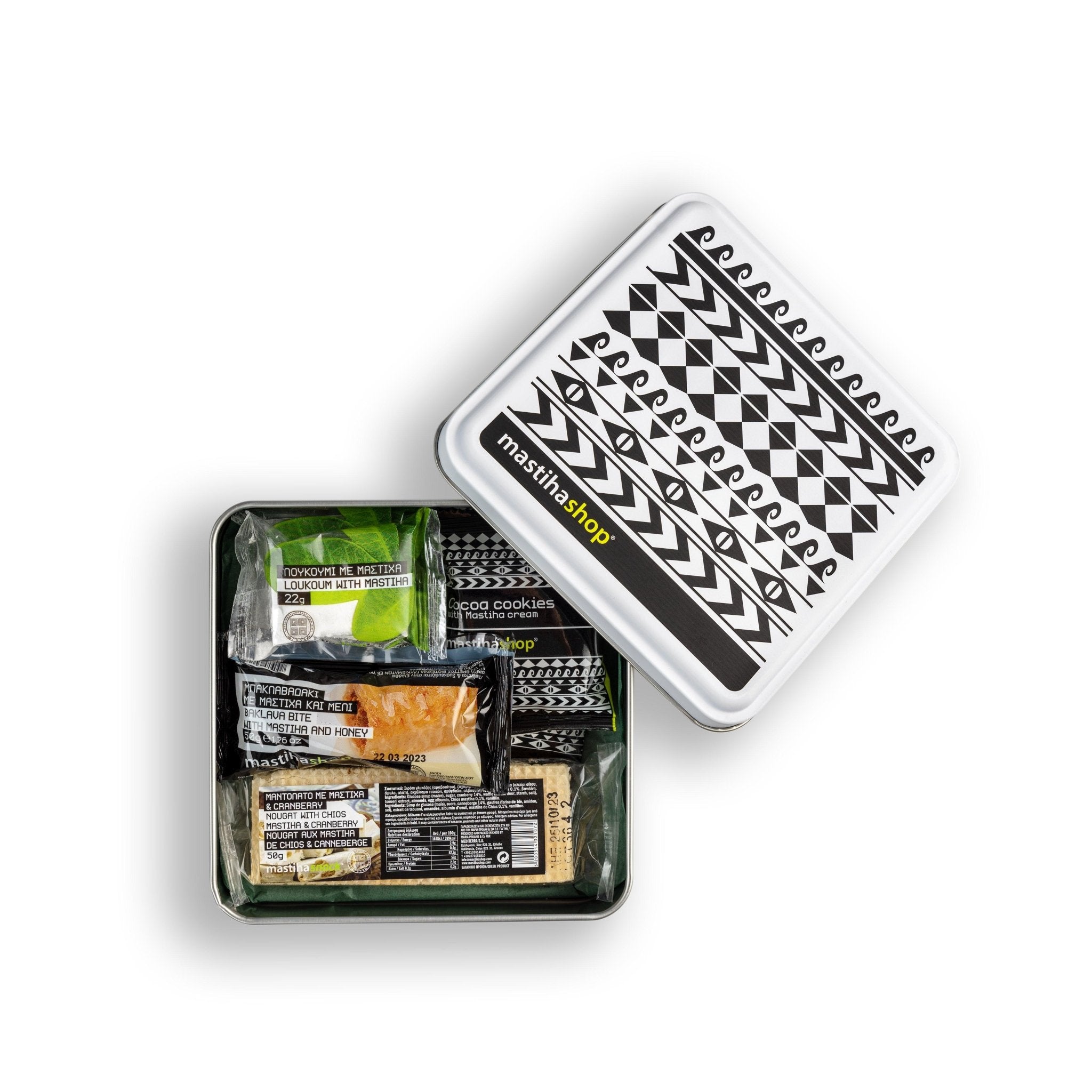 Μεταλλικό κουτί δώρου διαστάσεων 16,0 x 16,0 x 5,0 cm με σνακ με Μαστίχα Χίου.