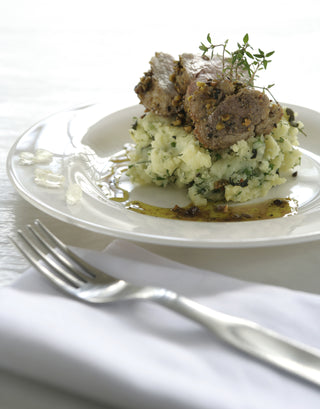- While the potatoes are boiling, prepare the pork: Preheat the oven to 180°C. Pat the tenderloin dry and season with salt and pepper. Place the pistachios, mint, oregano or marjoram, garlic, and orange zest in a food processor and pulse until finely chopped. Transfer the mixture to a plate.