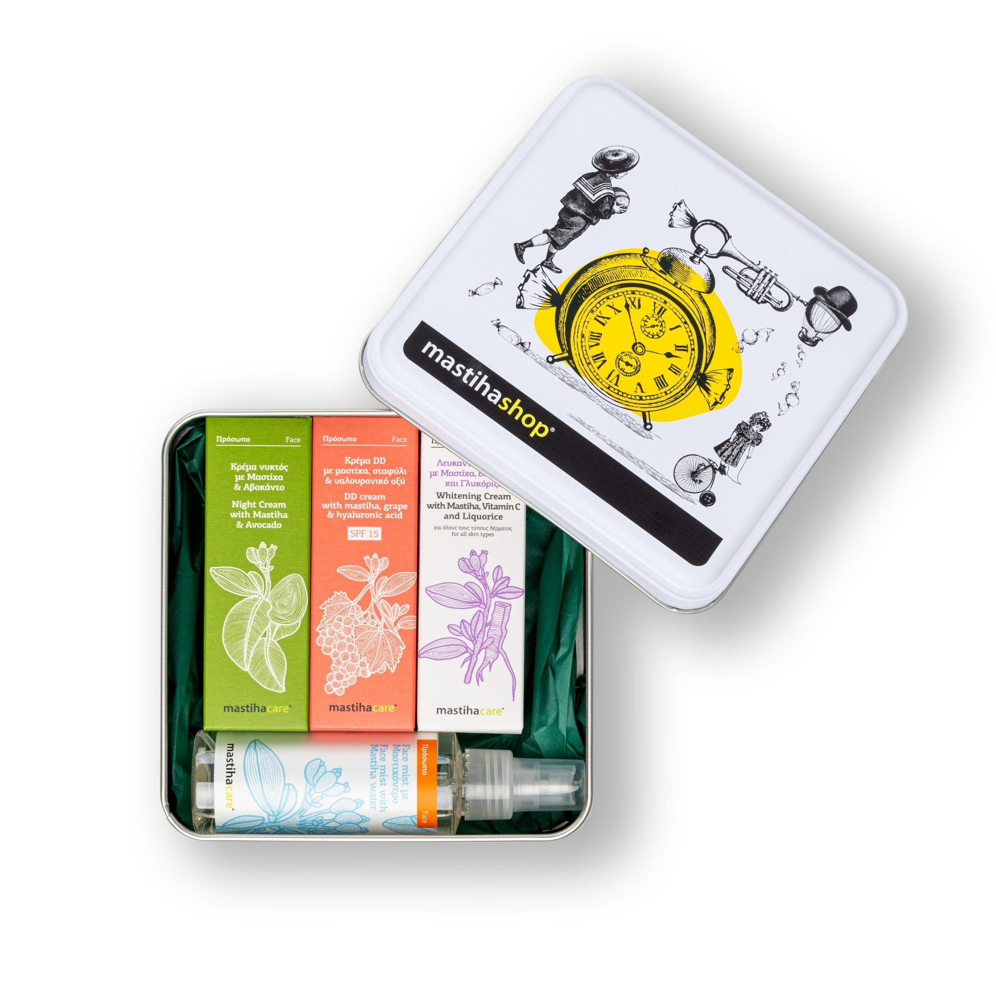 Metal gift box with dimensions 16,0 x 16,0 x 5,0 cm for face moisturizing.