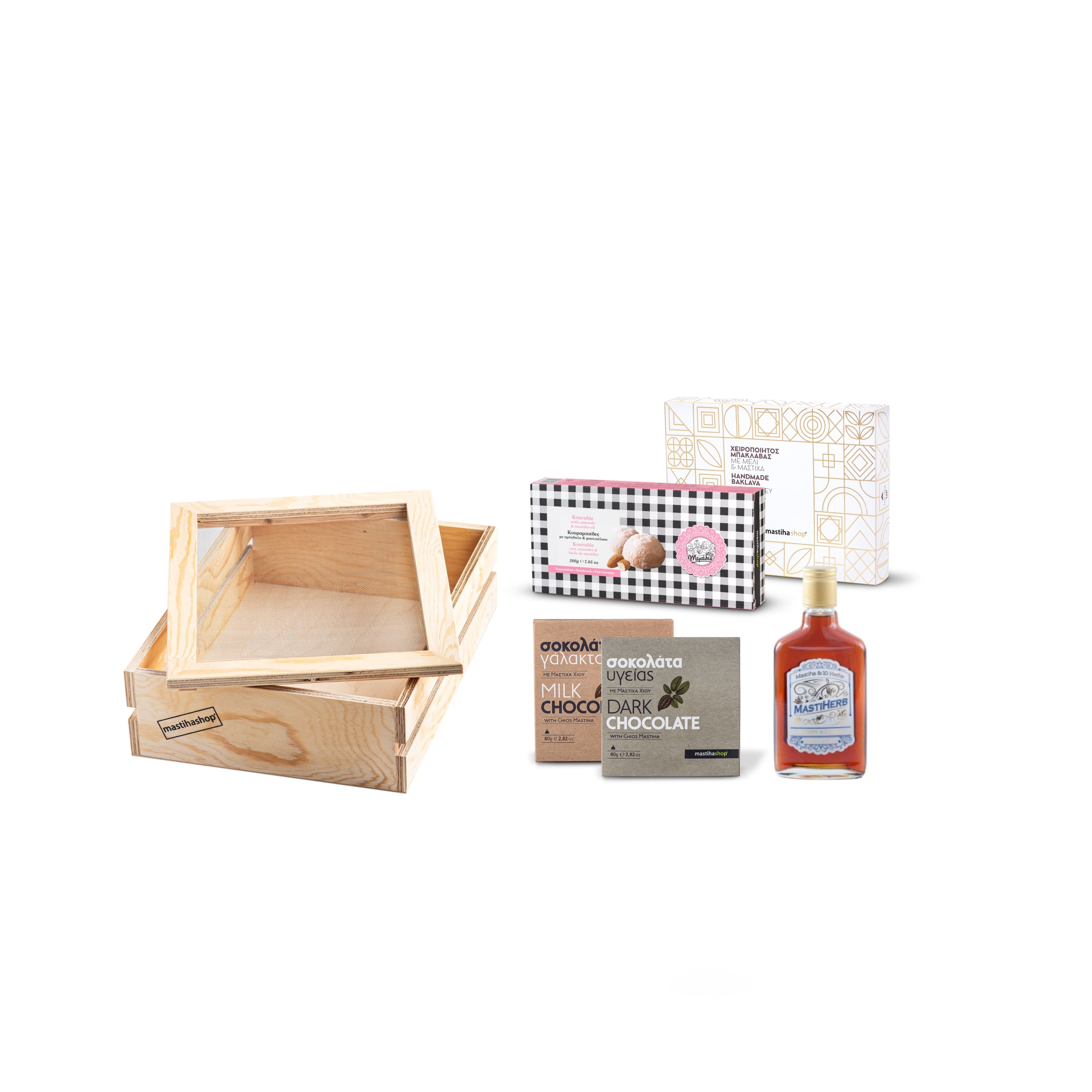Sweet traditions in one box! Enjoy baklava, kourabiedes, chocolates, and mastiha liqueur with herbs.
