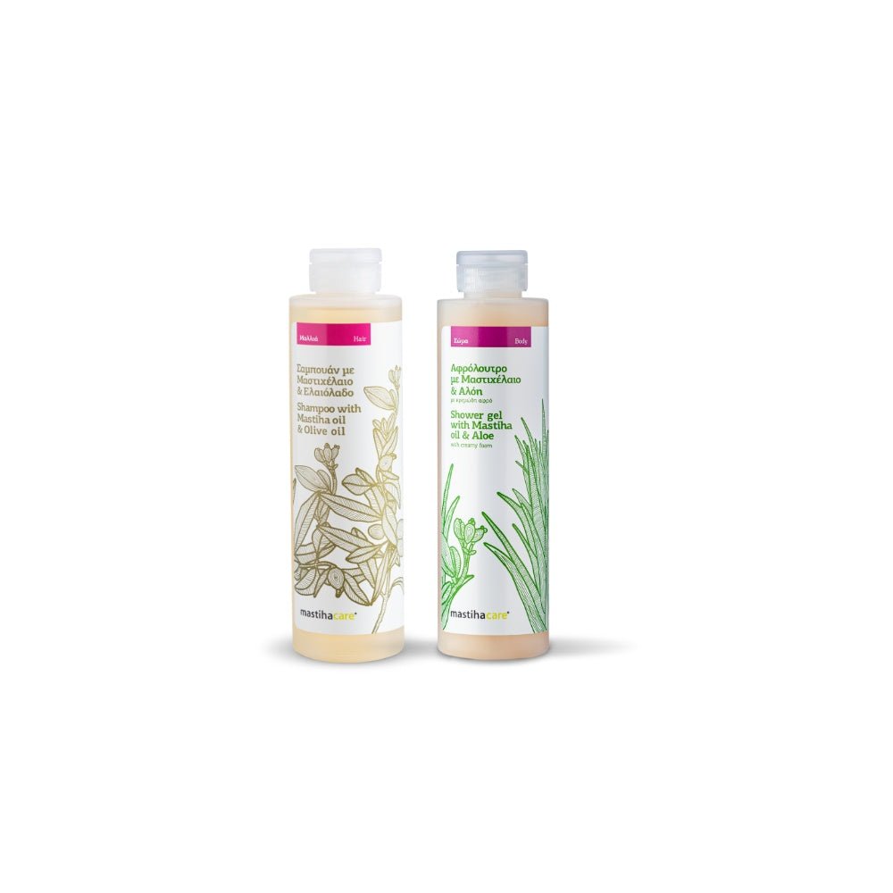 Shampoo with Mastiha Oil and Olive Oil for effective cleansing, hydration and nourishment, without irritation and Shower Gel with Mastiha Oil and Aloe for velvet and hydrated skin, at a unique price!