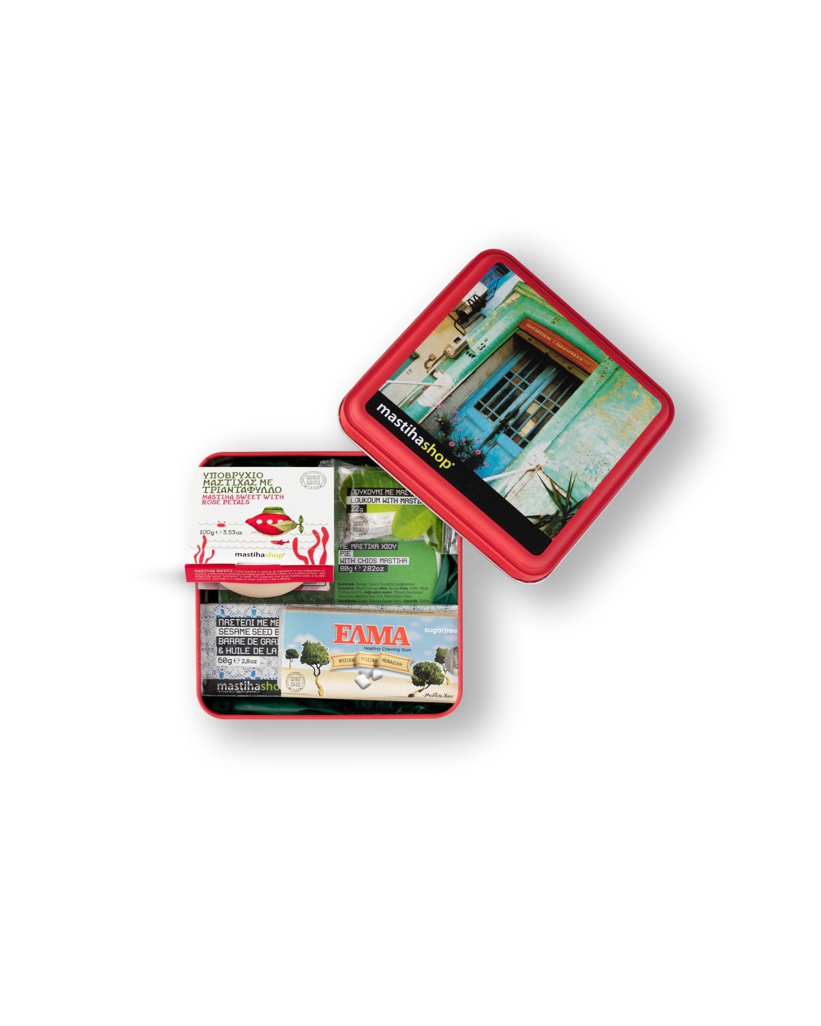 Metal gift box with dimensions 16,0 x 16,0 x 5,0 cm, with traditional products with Chios Mastiha.