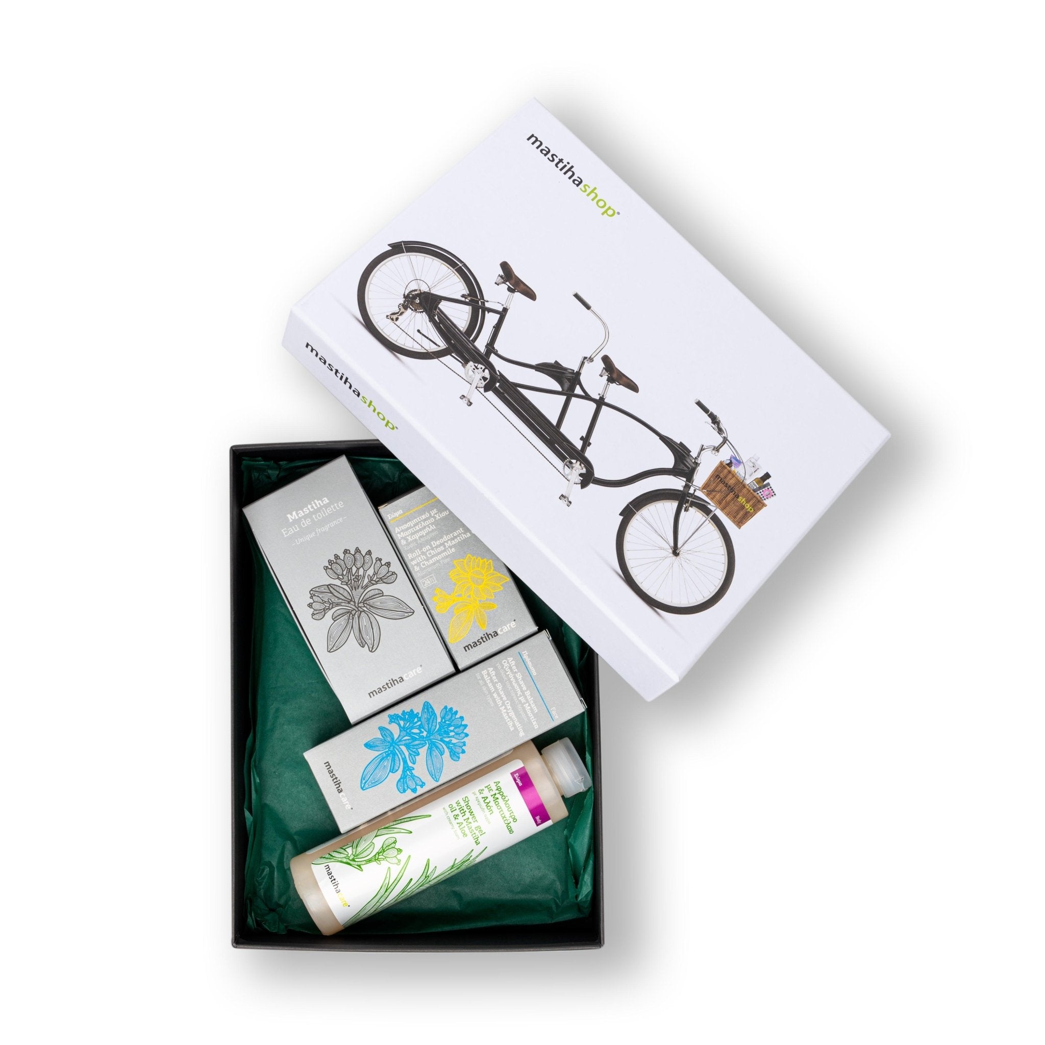 Χάρτινο κουτί δώρου διαστάσεων 27,0 x 19,5 x 6,8 cm με προϊόντα για ανδρική περιποίηση.